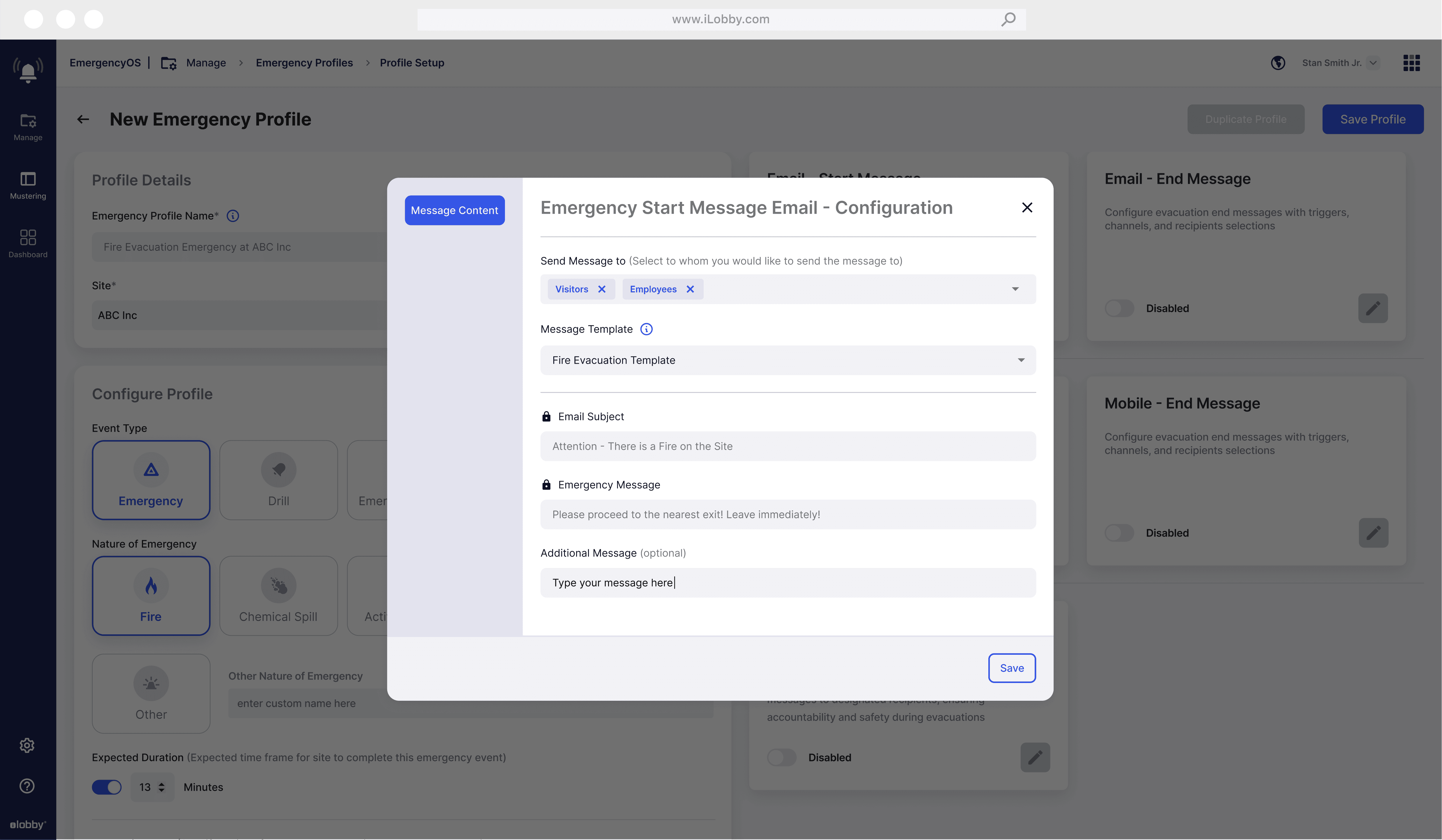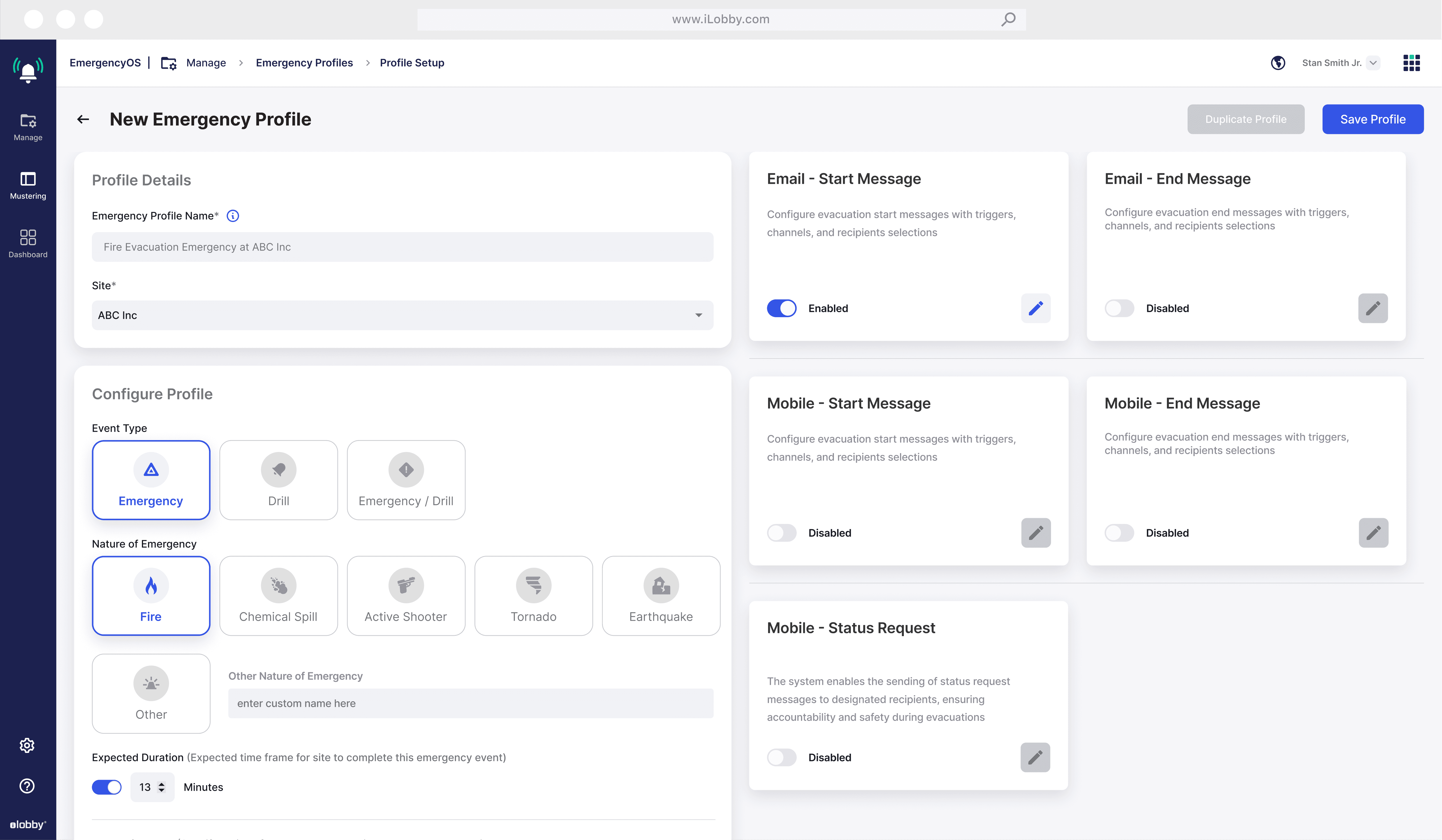 A flexible Emergency Profile template system is needed to manage crises like active shooters, fires, and earthquakes. It should support event scheduling, communication channels, mustering points, and safety protocols for both evacuation and alert-only scenarios.